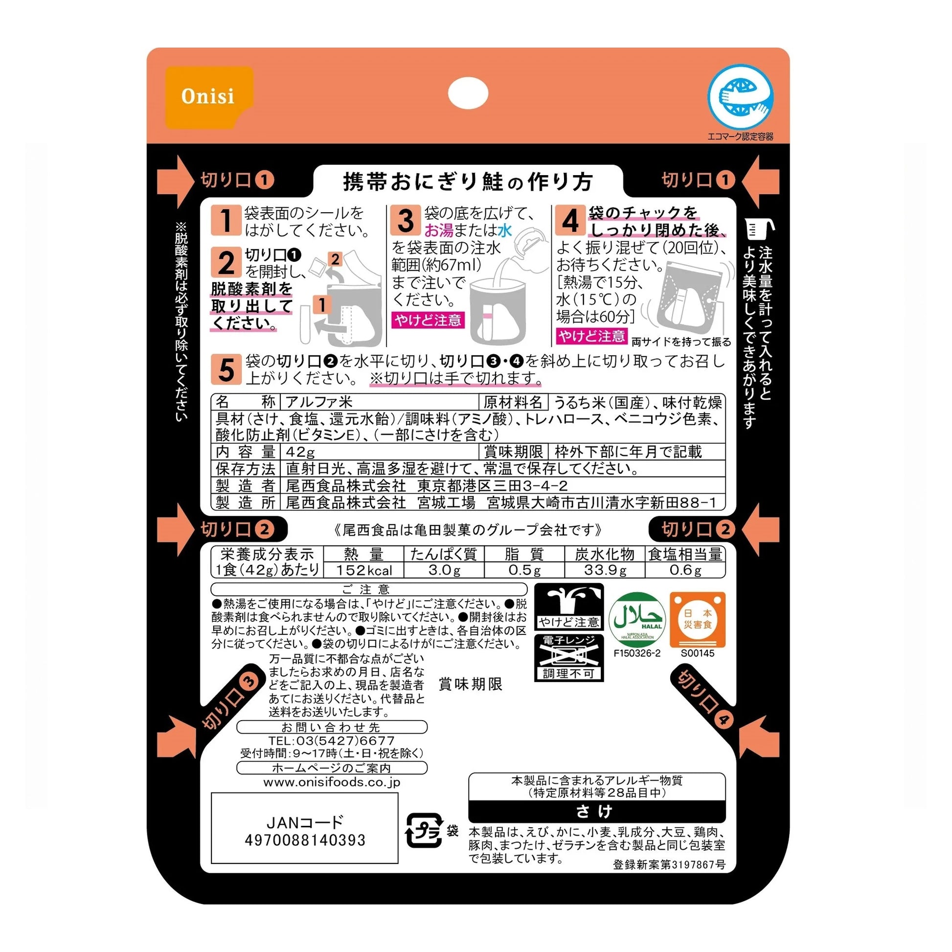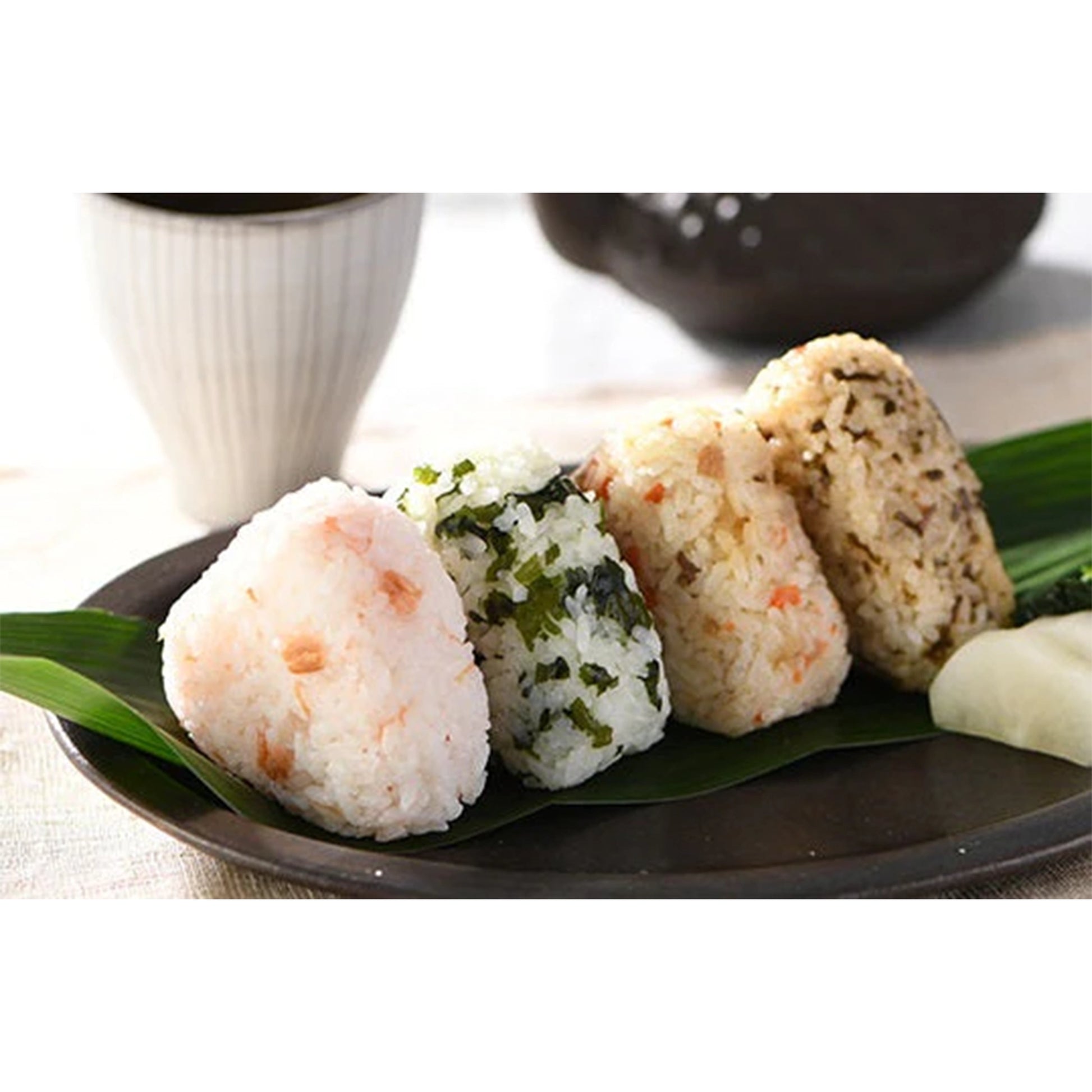 国産米100%使用。にぎらずにできる携帯おにぎり。お湯または水を入れるだけで具材の旨味がギュッとおいしい三角形のおにぎりができあがります。手を汚さずに食べられる3点カット方式。軽量、コンパクト、携帯性抜群でとても便利です。
