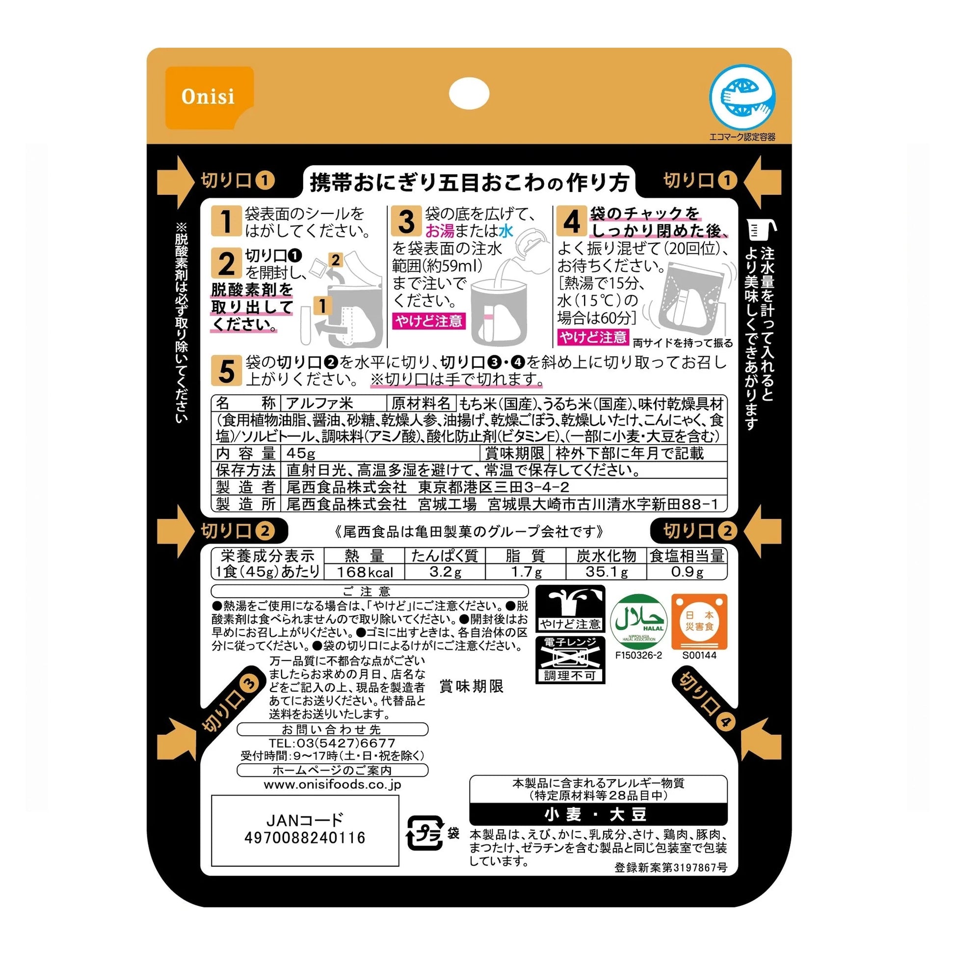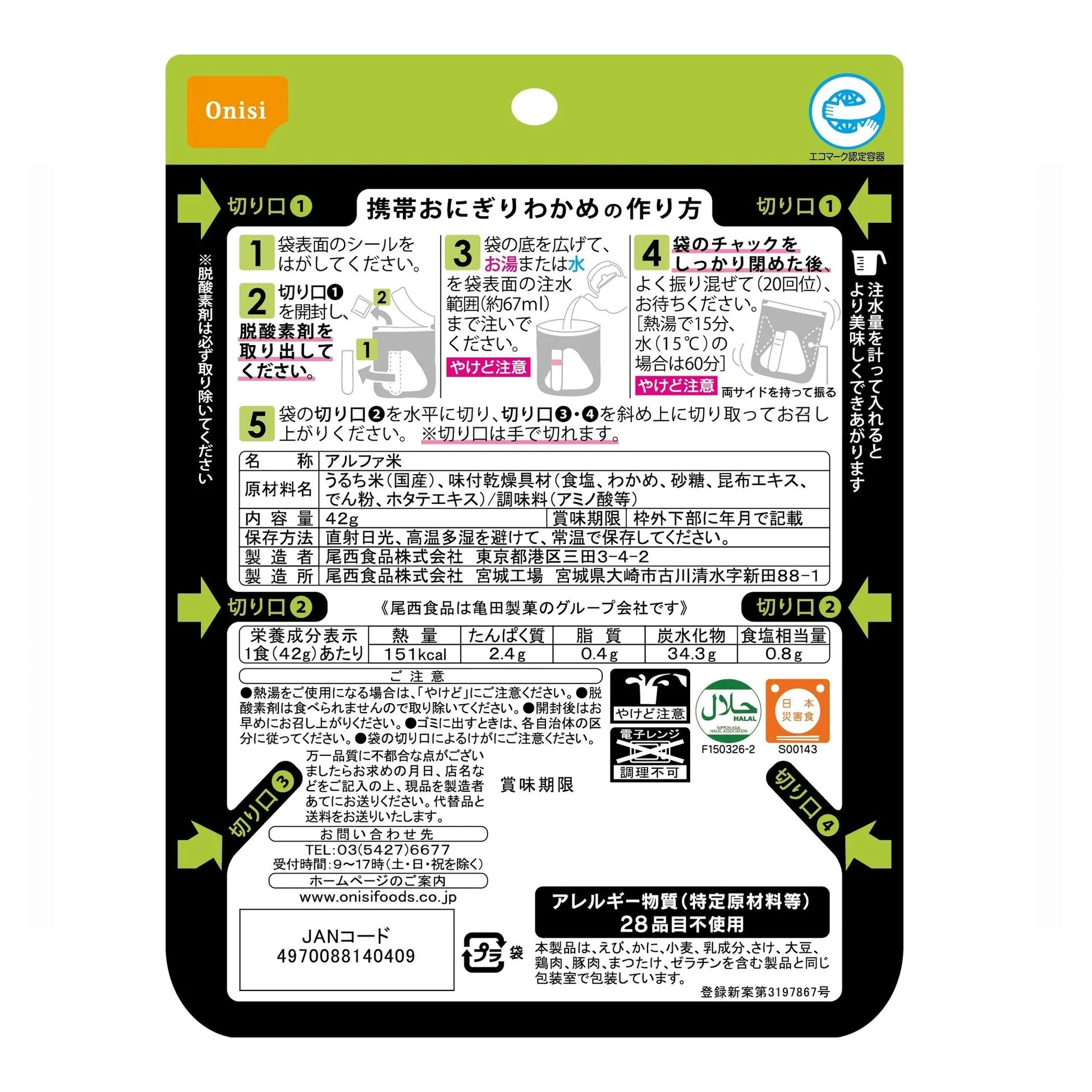 | 内容量 | 鮭:42g (できあがり量109g) わかめ:42g (できあがり量109g) 五目おこわ:45g (できあがり量104g) 昆布:42g (できあがり量109g) |