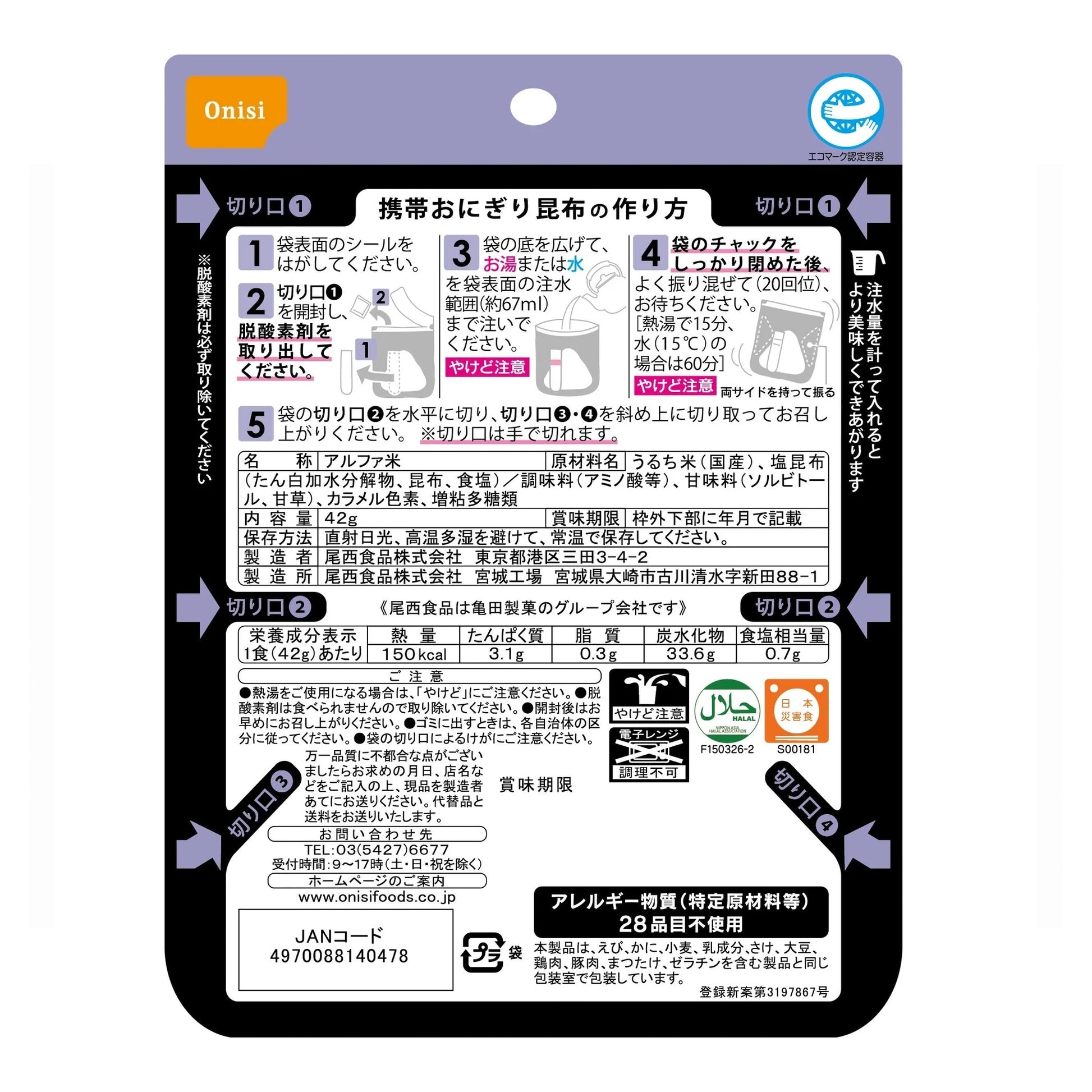 うるち米(国産)、塩昆布(たん白加水分解物、昆布、食塩) / 調味料(アミノ酸等)、甘味料(ソルビトール、甘草)、カラメル色素、増粘多糖類