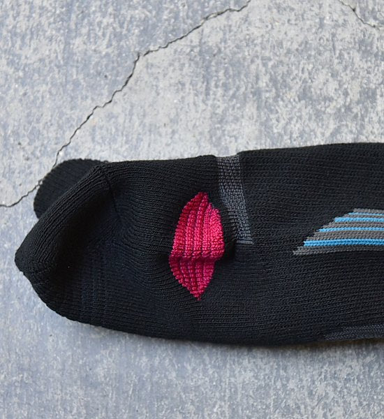 岩場や木の根など足の裏への突き上げから足を守るため、つま先/母・小趾球/かかとには衝撃緩和クッションパイルを、足首周辺にはシューズとの密着感向上・小石などの侵入防止・靴擦れ防止のフィットパイルを採用。