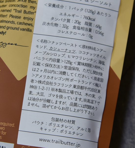 <原材料> アーモンド、カシューナッツ、ココナッツオイル、メープルシロップ、ヒマワリレシチン、海塩、バニラ <栄養成分 1パック(128g)あたり> エネルギー:760kcal、脂質:68g、コレステロール:0g、ナトリウム:0.22g、炭水化物:32g、食物繊維:0g、糖質:16g、タンパク質:20g <ご利用の際の注意点> Trail Butter は15〜10℃以下の低温下で硬くなり、絞り出しにくくなります。 これは原材料中のココナッツオイルが固まることによります(ココナッツオイルの融点は25℃でこれ以下になると透明な液体が白濁硬化します)。しかし温めれば柔らかくなり品質には問題ありません。 外気温が低い時はベースレイヤーのポケットに入れる、ウェストポーチに入れるなど体温が伝わるようにして携行してください。 多少かたくなっても手のひらで温めよくもんでいただくとやわらかくなります。 また高温下ではココナッツオイルが分離しパッケージの上部に浮いてきますが品質には問題ありません。開封前によくもんで内容物を混ぜてからお召し上がりください。 |