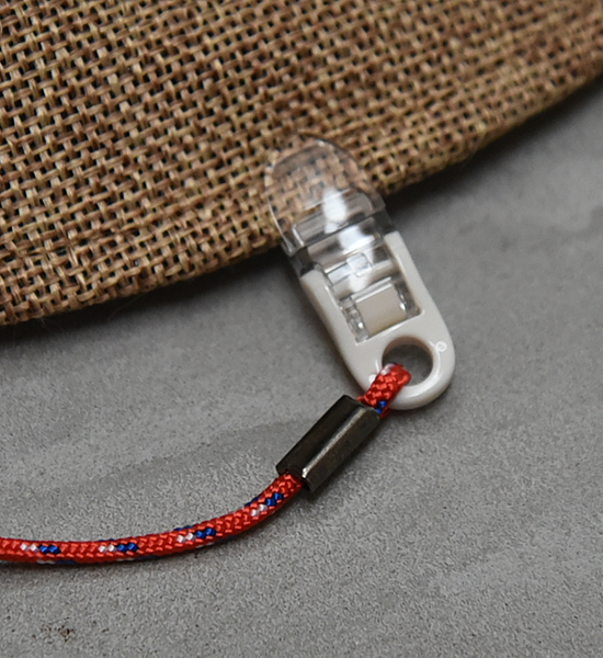 キャップキーパーで使用している紐は、日本国内で生産されています。素材は、ナイロン(東レ製)でアウトドアなどの専門分野で使用されています。2mm紐は、超軽量テントの張り綱などで使用されます。