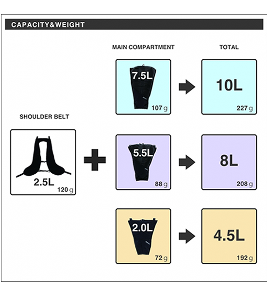 ショートからロングまで様々なシーンに合わせて容量の変更が可能。サイズ違いのメインコンパートメントを付け替えることで距離や目的に応じたパッキングができます。