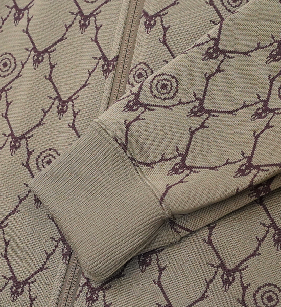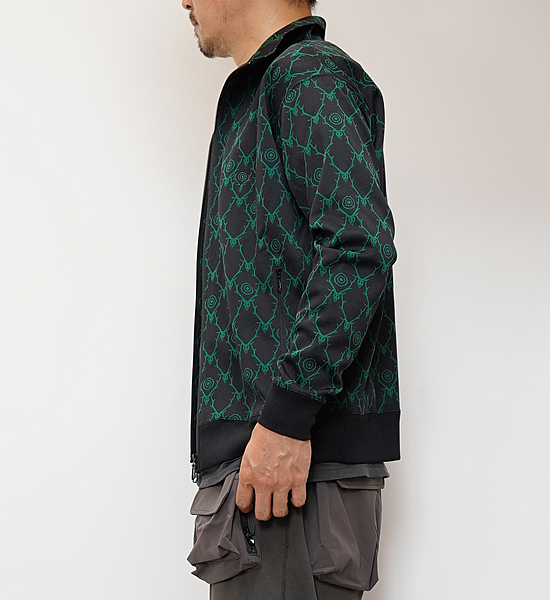 定番アイテム・トレーナージャケットが、ディアスカル柄のジャカード素材で登場。通気性・伸縮性に富んだポリエステルジャージー素材を使用し、タウンユースからアウトドアシーンまで活躍するアイテムです。胸元から袖までが一体になったユニークなパターンを採用し、サイドにはアクセントとなるラインテープが縫い付けられています。同素材でパンツも展開され、セットアップでもお楽しみ頂けます。