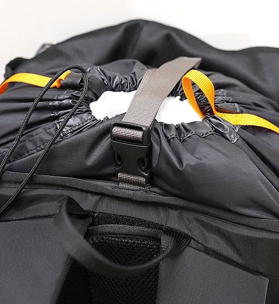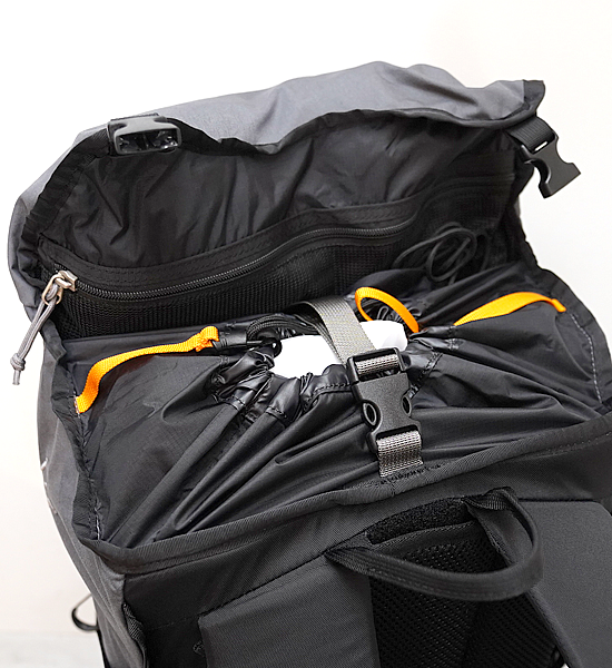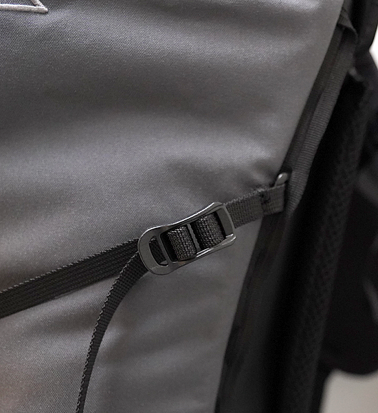 大容量のサイドポケットは背負った状態でアクセス可能です。ドローコードにより開口部を調整できます。