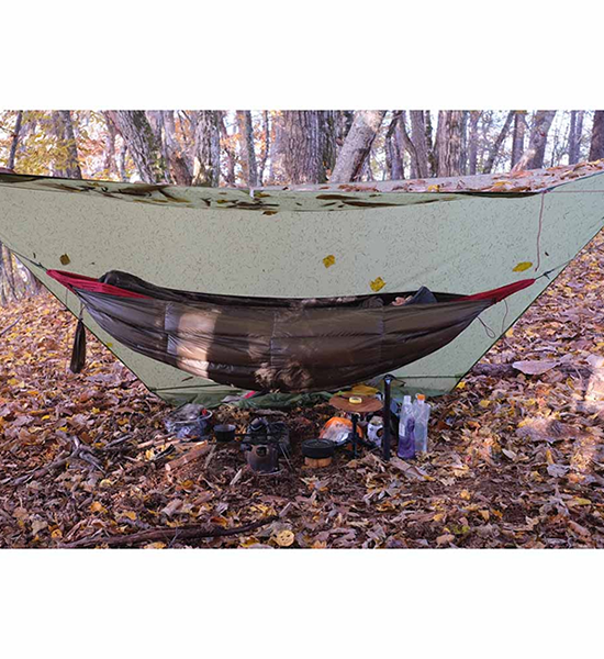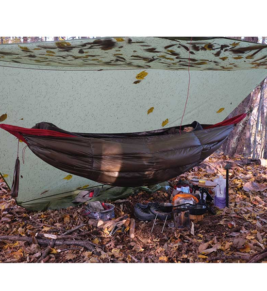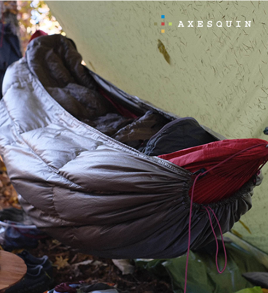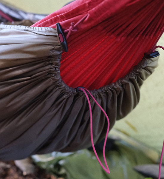 bluesign認証のホワイトグースダウンを採用したハンモックアンダーキルト120は、冬以外のスリーシーズンのシノギングに最適で、保温性とパッキング性のバランスに優れたモデルです。また、寒い季節にはお手持ちのハンモックシステムのブースターとして活用できる汎用性の高いアイテムです。