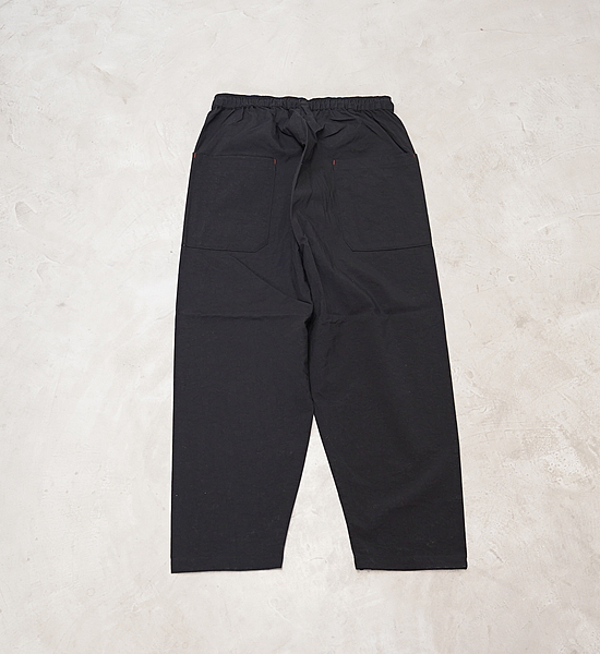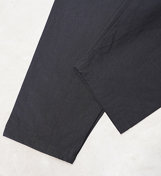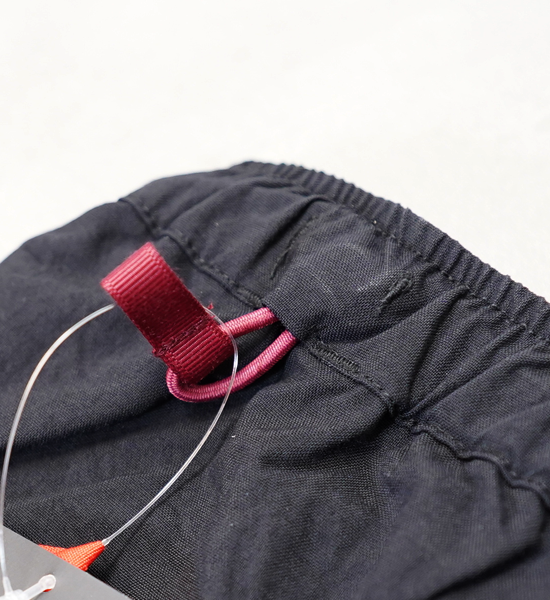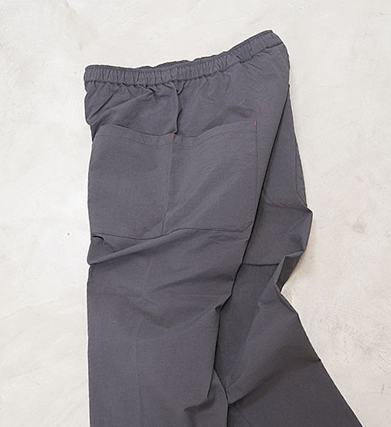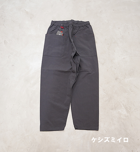 低山には似合わない大きいバックパックを背負って、ハンモックポイントまでの尾根を落ち葉に埋もれそうな踏み跡 を辿る。そんな静かな秋の低山を楽しむための、中途半端な丈が丁度いい、秋を感じて歩くパンツです。光沢を抑えた自然な風合いのヴィンテージ加工ナイロンです。やや太番手の糸を使用しているので引き裂き強度と耐 摩耗性に優れており、適度な防風性、撥水性、通気性を備えています。山仕事の作業着として使われていた野良着を再現しているので、ヒップから膝に掛けて少し太めになっていて動きに ストレスを感じません。また、膝から裾に掛けて細くなっているので悪い場所での足元確認がしやすくなっています。 他に、ナイロンベルトを排除してスッキリしたウェスト周り、バックパックのヒップベルトに干渉せず行動中に使い やすい位置にあるサイドポケットなど、凌ならではのアイデアを足して着心地を向上させています。 マタギを合わせてアクセントにクビマキを使うと素朴なデザインのパンツが生きるでしょう。それにハンテンを羽織 れば乙な着こなしの出来上がりです。