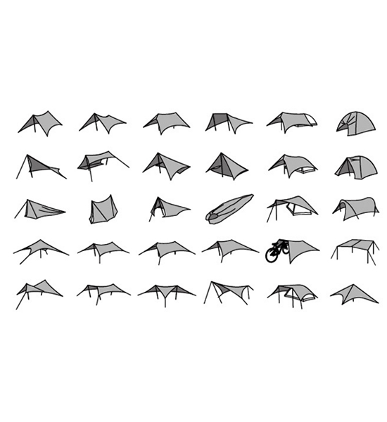 ・手裏剣シルエット。前後2辺のテンションスリーブ。21か所ものジョイントポイント。これらのユニークな機能により約30通りの張り方を実現しました。