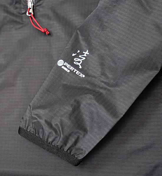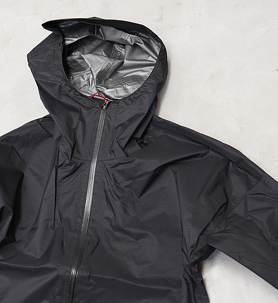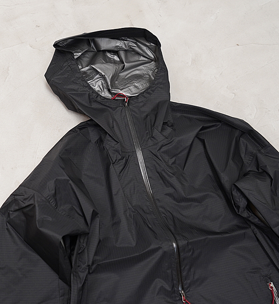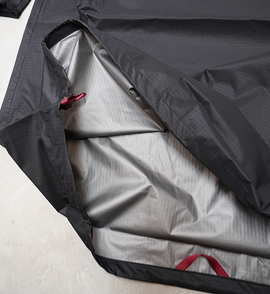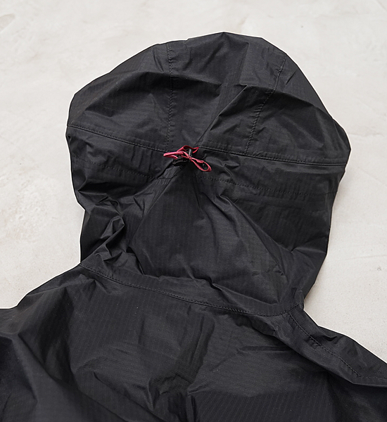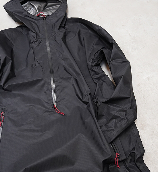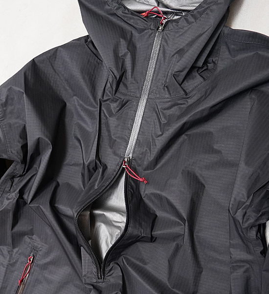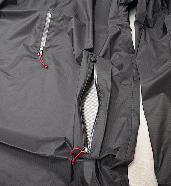 着丈が長く頭から膝まで覆うので容易には雨に濡れない安心感があります。防水透湿素材を使用していますが、気温や運動の程度によっては汗の放出が追い付かずに蒸れを感じたり内側が結露したりすることがあります。上下から開くフロントファスナーを下から開ければベンチレーションとして機能する他、フード周りを開くことなくインナーのシャツやヤマバッグなどにアクセスできます。また、長いフロントファスナーはパンツのように穿いたり脱いだりできるので便利です。腰の左右に配置されたジッパー(スルーポケット)はパンツのポケットにアクセスできるだけでなくベンチレーションとしても機能し、バックパックのヒップベルトを内側に通して止めることができるのでベンチレーションを妨げることもありません。