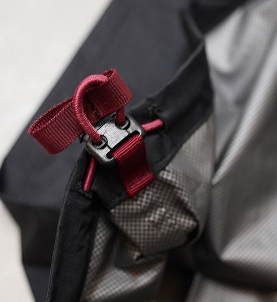 アメノヒを着たら足回りはクナイで固めましょう。これで雨を凌ぐ準備は万全です。雨の状況に応じて上半身だけ脱いで袖を腰で結べばレインスカートのように着ることができます。また、着物のように裾をたくしあげてバックパックのウェストベルトに挟めば、足上げが必要な露岩帯や歩巾が広くなる場所にも安全に対応できます。袖口裏の手甲ループに中指を通せば袖口のずり上がりを抑えることができ、裾中央裏の前後のループを紐などで結ぶことで裾のバタつきを抑えることができます。行動中に膝から下の濡れが気になる場合には「ツユハラヒ」を合わせて使うことで、より広範囲に雨を防ぐことができます。