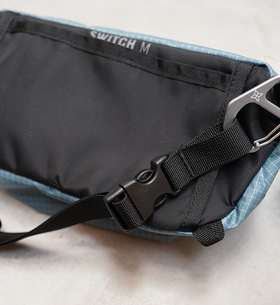 SWITCHの背面スリットにザックのウエストベルトを通して、サイドポケットとして使う事もできます。