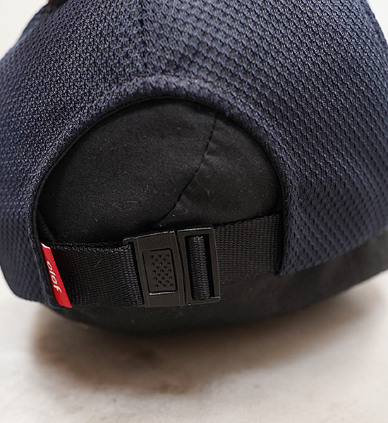 サイズ調整は、後頭部に薄型のベルト式採用。 ベルトの裾は、帽子の中に収納できる仕様なので、ランニングの途中にベルトがバタつく事も、ヘルメットインナーとして使用した場合に後頭部に干渉する事も軽減されています。