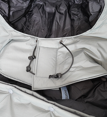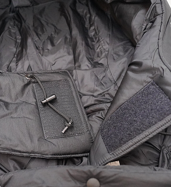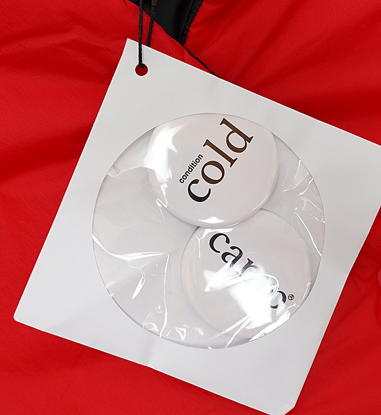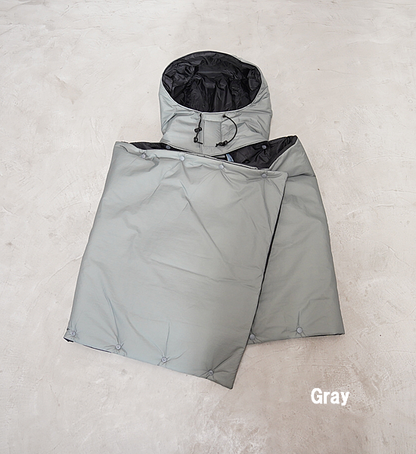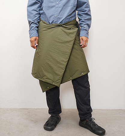 パフシートはドットボタン留めのアレンジで、ケープ(肩がけ)→キルト(腰巻き)→アーム&ショルダーウォーマー→フードの装着でフーディなどなど…幾多もの顔を持つマルチ可変の便利な防寒アイテムです。素材にはなめらかでやわらかなテクスチャーのリサイクルナイロンを採用。シンサレート中綿といった対防寒の必須スペックはもれなく付いてきますのでご安心を。山アクティビティシーン(主にキャンプ)の保温ブースターとして備えるべし。お天気ワードの缶バッジが付属。
