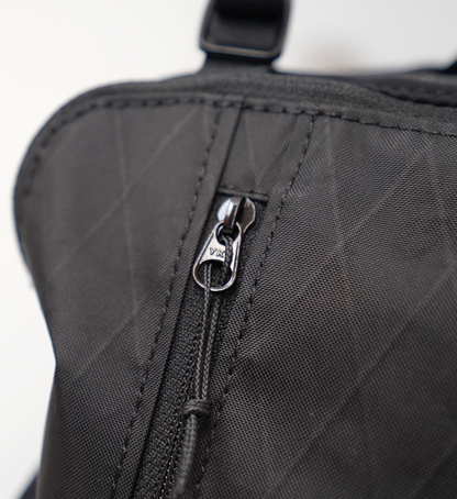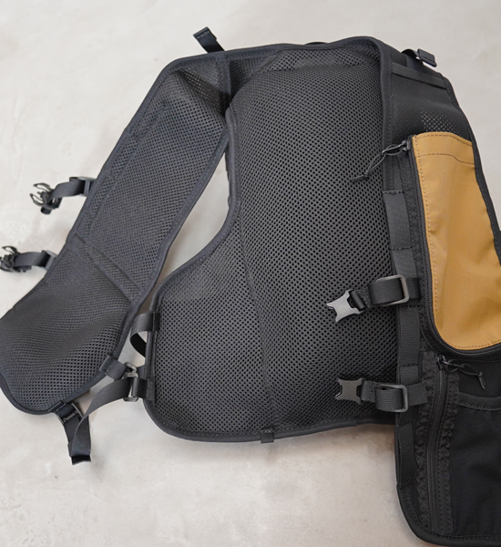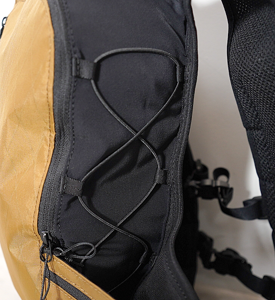 MMA が目指したのは「特化していない」こと。2016 年にリリースした MMA オリジナルランニングバックパッ ク「DUSTY」のアップデートバージョン。街ランからロングトレイルまで、多くのシーンに対応する機能性とデ ザインを備えた汎用性の高いランニングザックを目標に開発した。 MAIN COMPARTMENT:メインコンパートメントは収納物が下に貯まらず(重心が下にならないように)、逆 台形型になっています。内容量は最大約 8L で、国内外の 100 マイルトレイルランニングレースの必携品を収納 できる容量を確保。出し入れがしやすいように、ファスナーで蓋部が大きく開閉します。蓋裏側にはメッシュポケッ トがあり、内容物が整理しやすくなっています。ハイドレーションは非対応です。 (※)本体は撥水素材の X-PAC と止水ファスナーを使用して、ある程度の撥水性はありますが、縫い目にシーム 処理をしていないため、完全防水ではありません。 MAIN POCKET:メインコンパートメント蓋部分の大ポケット。厚み(奥行き)は薄いですが、大きめのファスナー と前面に配置しているため、取り出しやすいポケットです。 SUB POCKET:メインコンパートメント左右のサイドサポート部分にもポケットを装備。内側はパワーメッシュ にして容量を確保。ハンドライトや補給などを入れることができます。 DRAW CODE:メインコンパートメントサイド部分のドローコードにより、ストックポールを外付けできます。 また、ドローコードを締めることでメインコンパートメントのマチ(厚み)を調節できます。空身で締めれば、厚 みのないベストのように着用できます。