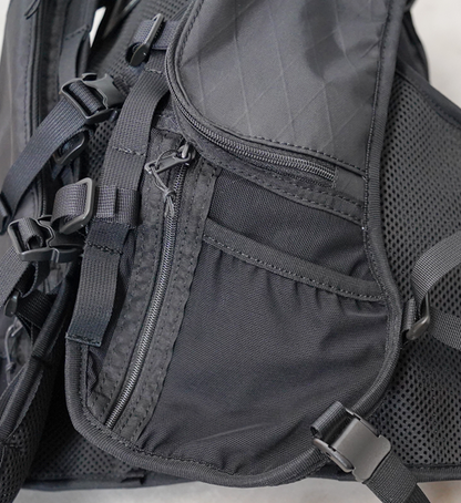 BOTTLE HOLDER and MESH POCKETS 特徴的な開閉式のボトルホルダーは、開けばフラスクからサイクリングボトルまでが収納可能。マチはパワーメッ シュになっており、ドローコードで締めることでランニング中の揺れを軽減します。使わない際は閉じれば邪魔に ならず、タウンユースでも使いやすいデザインです。 ボトルホルダー上部の小ポケット、財布や鍵など落としたくない貴重品を入れるファスナー付きの横ポケットと、充分な収納力。行動しながらアクセス可能です。