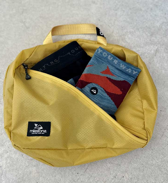 トレイルランニングのレースやその他アウトドアアクティビティには旅の道具が必要になる。対角線上に施した斜めのジッパーは瞬時に必要なアイテムを取る事ができる優れた設計です。また両面に部屋が分かれている便利な仕様のマルチコンテナ®は、使用前と使用後の着替えや、補給食の小分けとして『Mサイズ(8㍑)』が重宝します。そしてダウンやアウターのような嵩張ったモノ、又はシューズやリカバリーサンダルなどを容易に収納出来る『Lサイズ(15㍑)』の2サイズ展開。milestoneのユーティリティバッグにもスッポリ入り、スタッキングが出来る安心設計のマルチコンテナ。鞄の中でも見つけやすい『パイナップルイエロー』と落ち着いた色目の定番カラー『シャドウブラック』の2カラーをラインナップ。