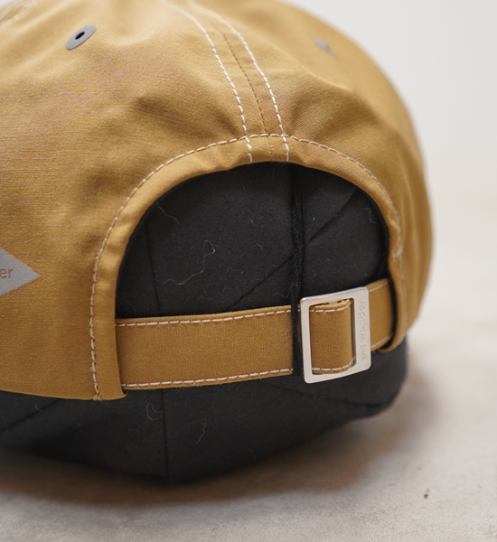 リサイクルポリエステルとオーガニックコットンの混紡糸を高密度に織り上げたサスティナブル生地を使用したキャップです。後ろに付いたストッパーでフィット感を調整できます。撥水加工が施され、適度な通気性があります。