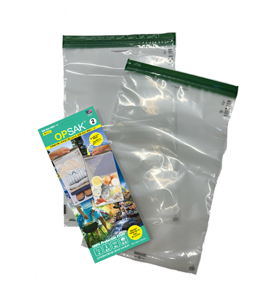 ロックサックの特徴に“防臭”性能が加わった“OPサック”は、内容物の臭いを完全に閉じ込め、外へ漏らしません。そのため、生物や野菜などの臭いの気になる食品を入れても保存でき、フリーズドライ食品ならばOPサックに入れたまま熱湯で戻すことも可能です。またすぐに洗濯のできない着衣済み衣類や臭いが残る使用済みのオムツなど、その場に放置できないものを密封ジッパーでしっかり臭い漏れ・液漏れをも防ぎます。大雨による洪水災害に直面しても、水で濡れて困るものや泥などから『大切なものを汚さず守ります。』