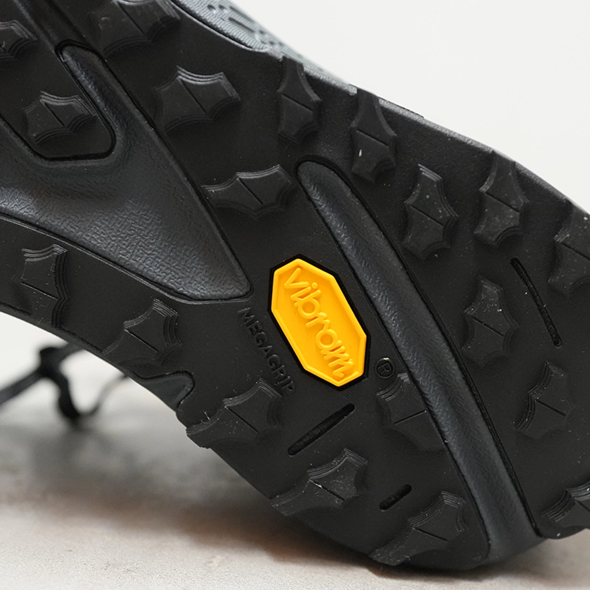 アウトソールは Vibram® Megagrip をベースに、より高いトラクションを狙って再設計。乾いた路面はもちろん、濡れた路面でもグリップへの信頼感を高め、攻めたい場面でもブレにくい足元をつくります。