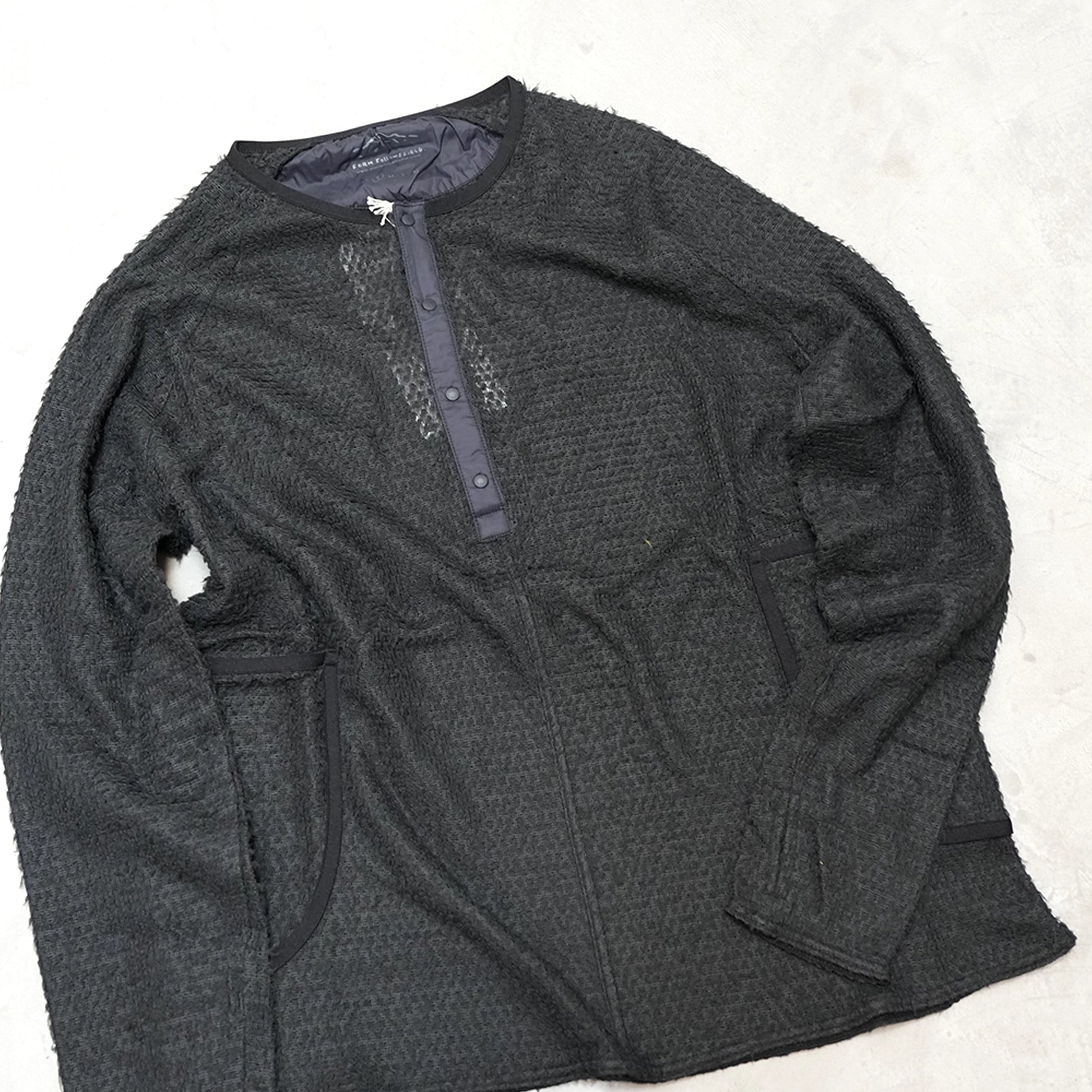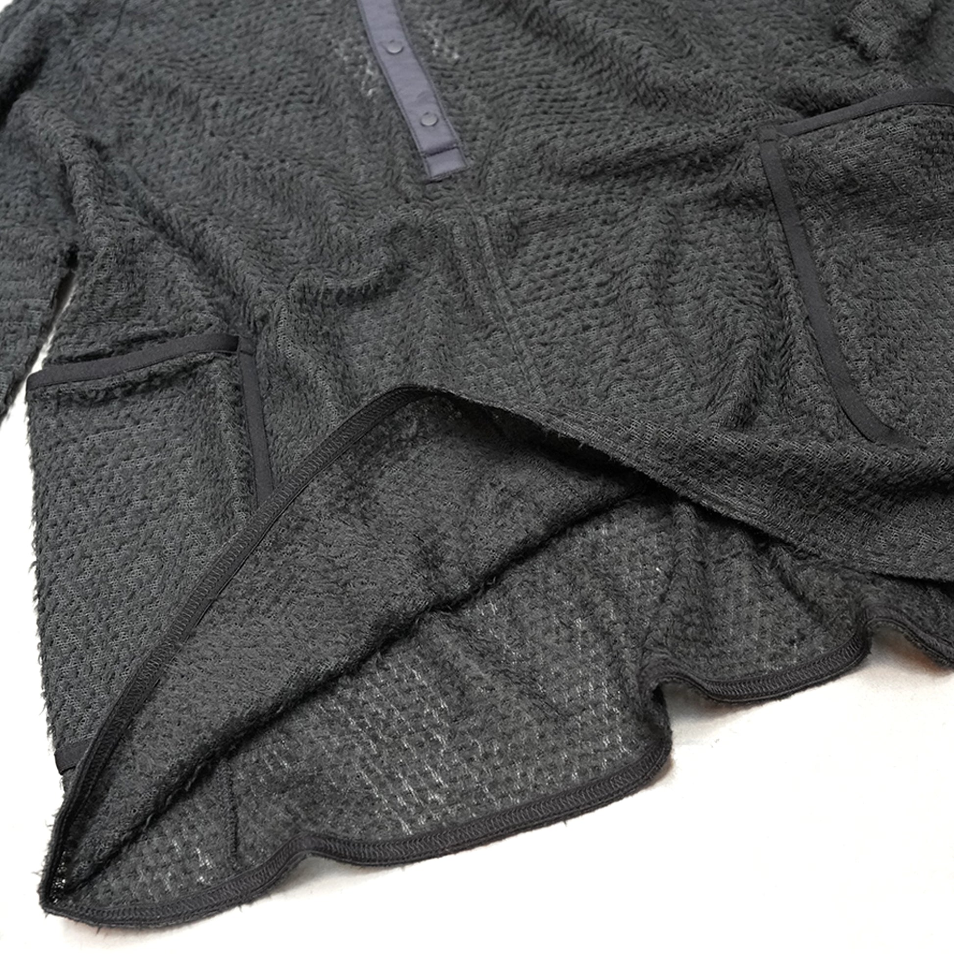 アウターにすれば蒸れない行動着、1枚羽織れば暖かい保温着。フーディーと対になるウエアとしてヘンリーネック型を作りました。98.5gととても軽くもはや何を着ているか分からない、空気は言い過ぎですが空気を纏うから暖かく、またメッシュ状なので通気性もよく蒸れない。Tシャツの上に着て通常であれば蒸れるシーンでも蒸れないのです。コンパクトにまとまるのでお守りとしても◎