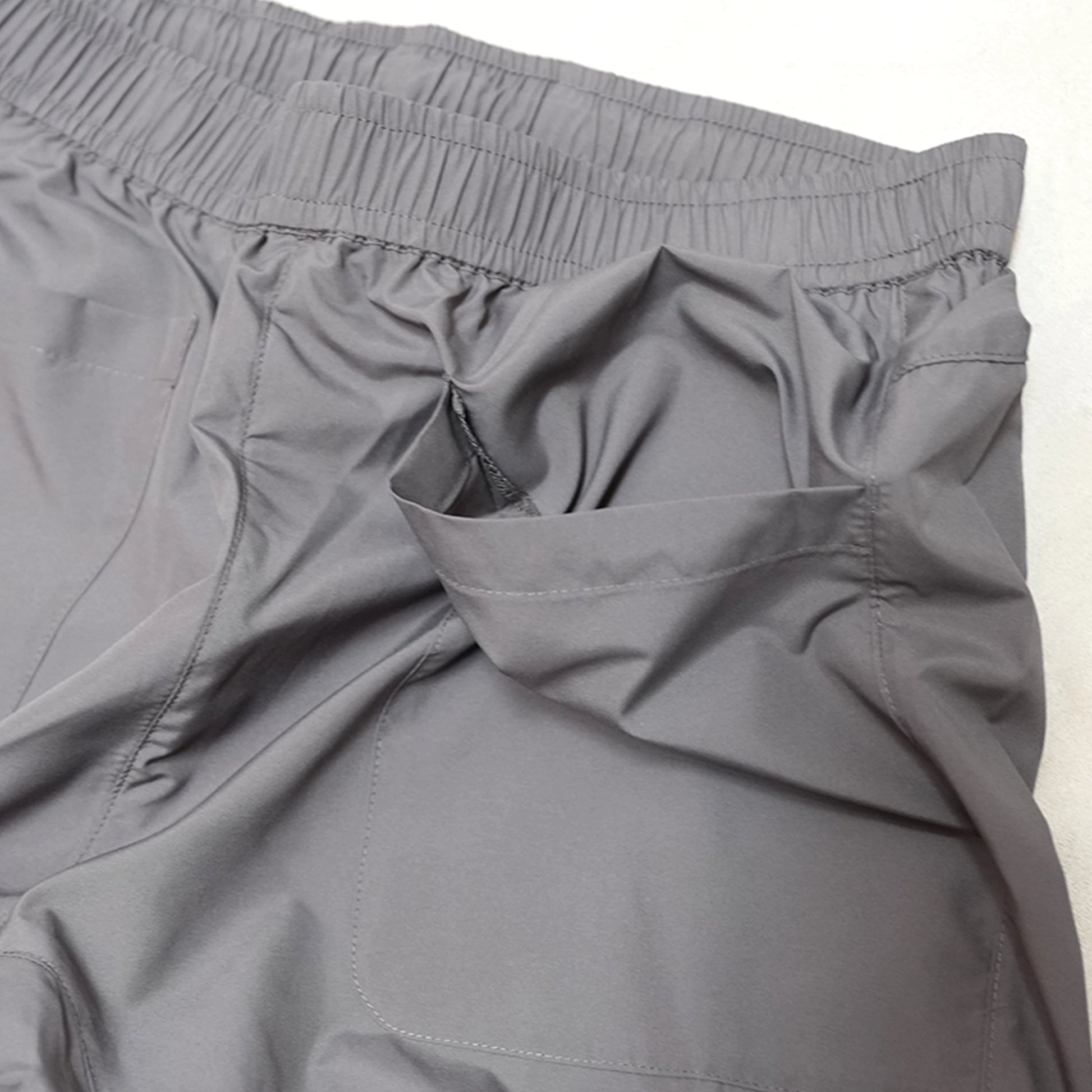 夏の山用パンツ、Hiker’s Summer Pants。素材はポリエステル100%。薄くて軽く、さらっとした生地なので履き心地がとても良く、また撥水性能が特徴的。一般的な撥水剤によるものとは違い稲の穂が水を弾く仕組みと同じマイクロガーター構造という手法で水を弾きます。(防水ではありません。)汗抜けと速乾性もこの生地の特徴です。ストレッチしないためできだけ足さばきがし易いよう幅は少し広めで、裾はゴムではないですが広くなりすぎない幅です。ウエストはゴム。ポケットは山と高原地図がすんなりと収まる深さです。パッカブルではないですがコンパクトになります。