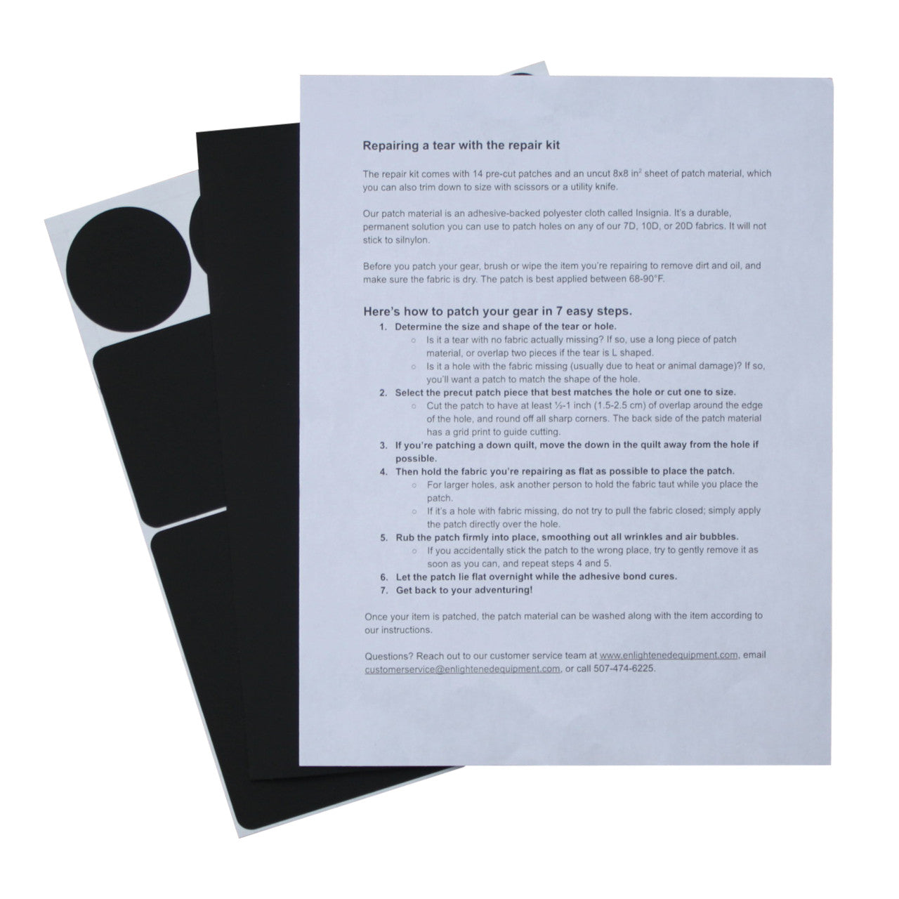 ・7D・10D・20D生地を含むENLIGHTENED EQUIPMENT製品、およびテント・バックパック・衣類などほとんどのギアの穴補修に対応。