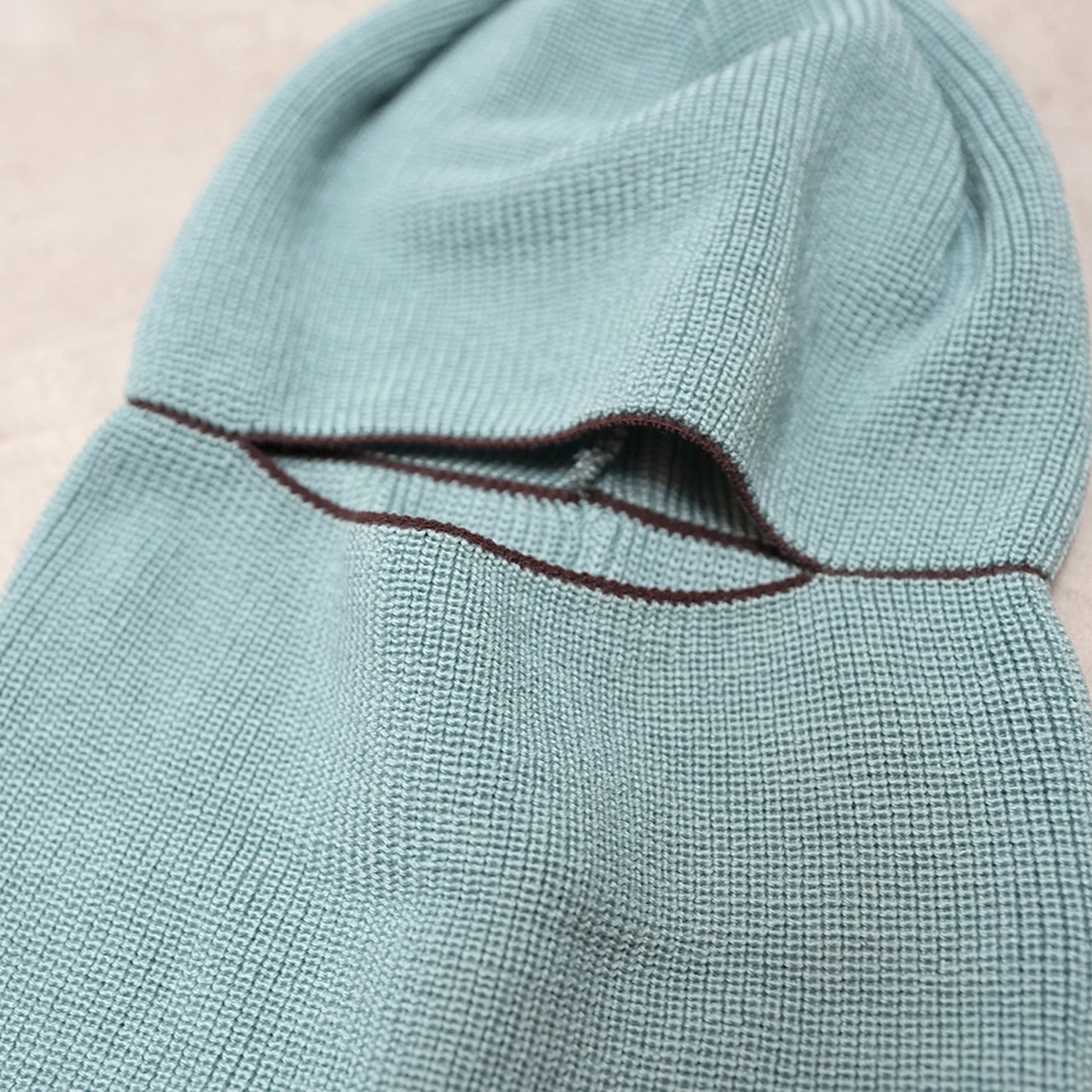 エクストラファインウールを使用し、しなやかで上質な風合いに。繊維表面の凹凸を整える加工を施すことで、チクチク感の少ないソフトな肌触りと、均一で豊かな発色を実現。保温性にも優れ、寒い季節のアウトドアやデイリー使いに活躍するバラクラバ。