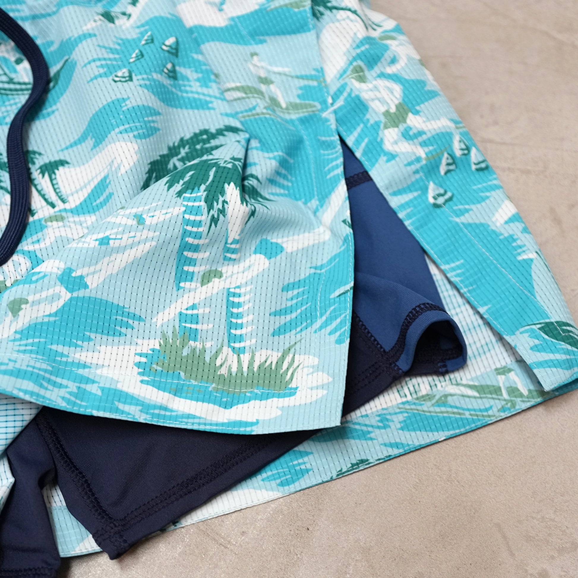 深いサイドスリットで走りやすさを追求したランニングスカートです。日本製のオリジナルボディは、ロード&トレイルラン時の足さばきを妨げないサイドの深いスリットが特徴。ファスナー開閉式の背部のポケットは、補給や鍵、スマートフォンなどを収納できます。ウエストはゴム+紐で調整可能。2トーンカラーのライナーは4ウェイストレッチで消臭効果もある吸水速乾素材を使用。肌触りが柔らかく、高い伸縮性と立体的な構造で快適な着用感を実現。サイド部分にスマートフォンを収納できるポケットを装備。本体素材は、通風孔があり通気性の高い東レの撥水素材「Dot Air®」を使用。吸水速乾・ストレッチ機能に加えて薄く軽量で、長時間着用していてもストレスを感じません。機能を損なわない昇華転写でヴィンテージアロハをサンプリングしたオリジナル柄を全面プリント。ファッションの価値観にアクティビティの機能性をプラス。アクティビティでのモチベーションを上げ、タウンユースでは機能を実感します。シームレスに活躍するプロダクト。