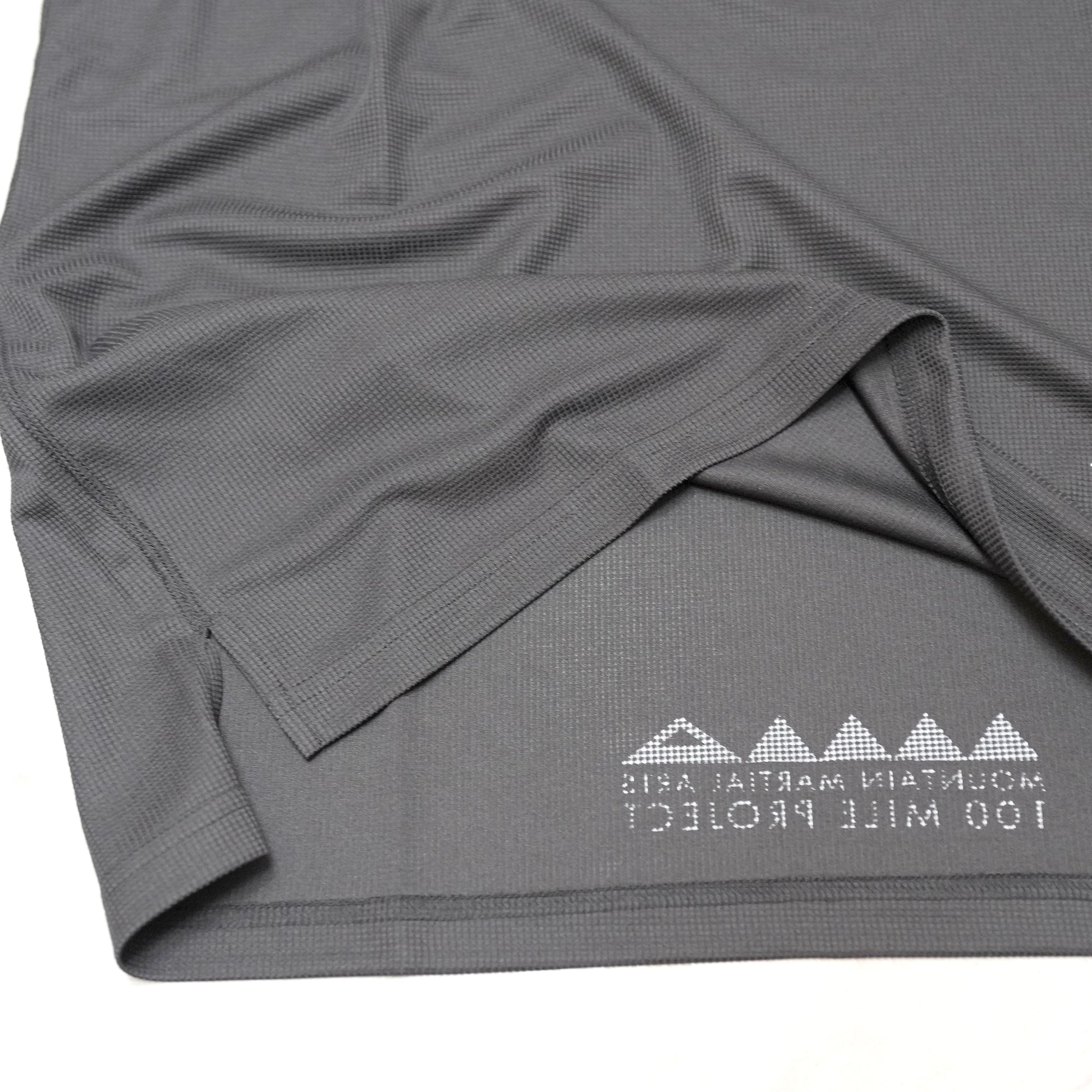 MOUNTAIN MARTIAL ARTS誕生の原点は100マイルトレイルレース。その原点に立ち返り、MMAを愛用する100完走者の意見とテストを重ねて誕生した「MMA 100MILE PROJECT」。100マイルトレイルに挑戦するランナーに向けて目指したプロダクトは「市民ランナーが市民ランナーのために考えたプロダクト」。MMAが積み重ねた実績のあるプロダクトをベースに、100マイル向けにアジャスト。トップスはハイパフォーマンスランナー向けに開発したスリーブレスをTシャツ化。長時間の行動でもストレスにならないように、肩幅と身幅を締め付け感のないゆとりのあるサイジングに。日本製のオリジナルボディは、前面の胸から上、背面の肩甲骨部分を大きく速乾メッシュで切り替えています。ランニング時に動きを妨げないラインで切り替えながら、通気性を向上。メッシュ部分はMMAオリジナルタイガーカモをプリント。本体素材は、世界的に評価の高い優れた吸水速乾性・UVカット機能を持つ「POLARTEC® Power Dry」を使用。特徴的な細かいグリッド状の表面は高い通気性と速乾性を持ち、しなやかで肌触りがよい着心地です。ゼッケンを付ける胸元ではなく、裾に格闘家の名言をプリント。これまで培った経験値と100マイルランナーのアドバイスを活かし、機能とデザインのバランスを追求したMMAのフラッグシップモデルです。