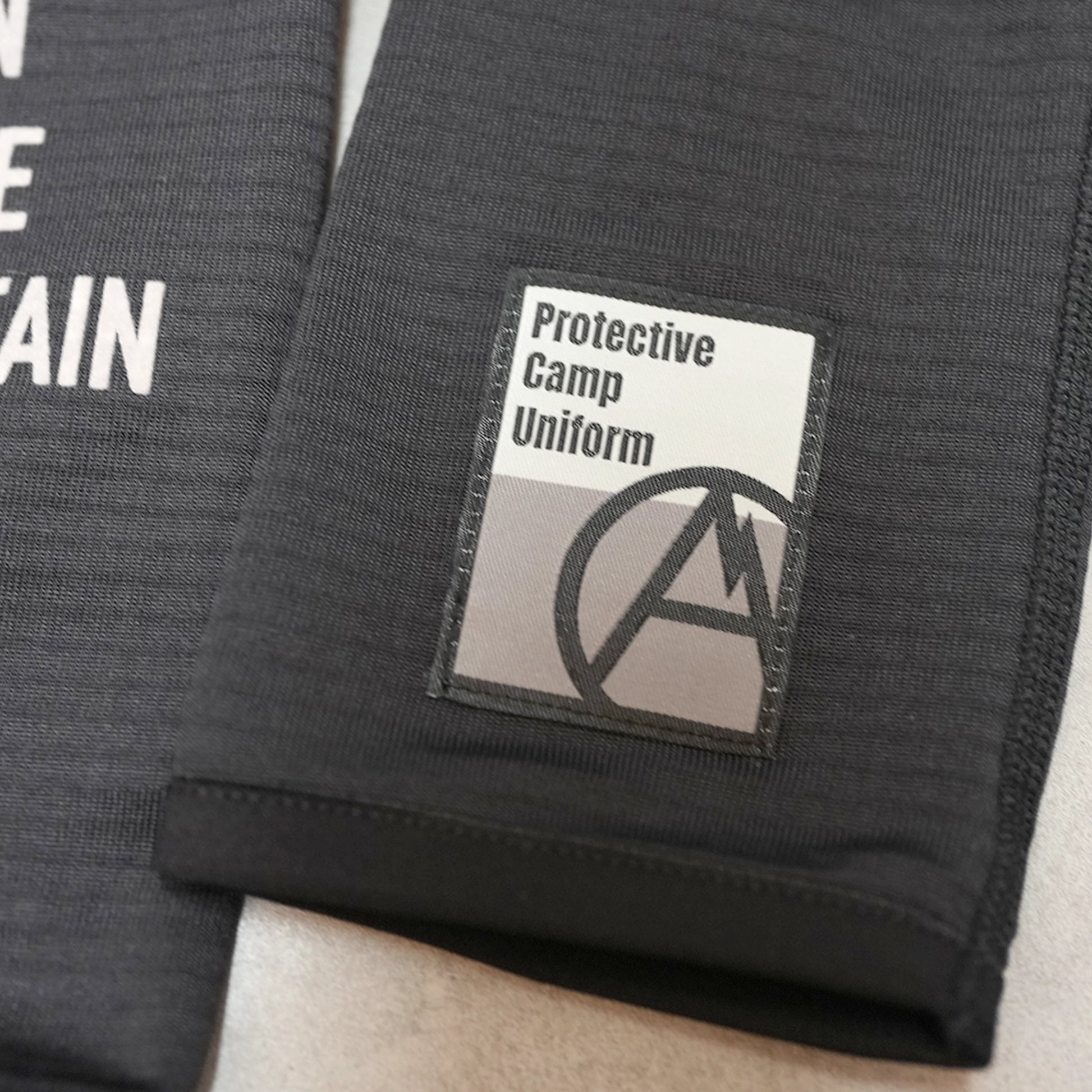 チューブ型ハンドカバー。素材は、伸縮性と保温性に長けた3D構造のグリットフリース。袖の延長パーツと捉えるとさらに使い勝手が良いです。右には、シーズンのキーワードの1つ、”HEAVEN IN THE MOUNTAIN”フロッキープリント、左にはPCU タグのアシンメトリー配置は、左右間違えの混乱を解消するためのもの。