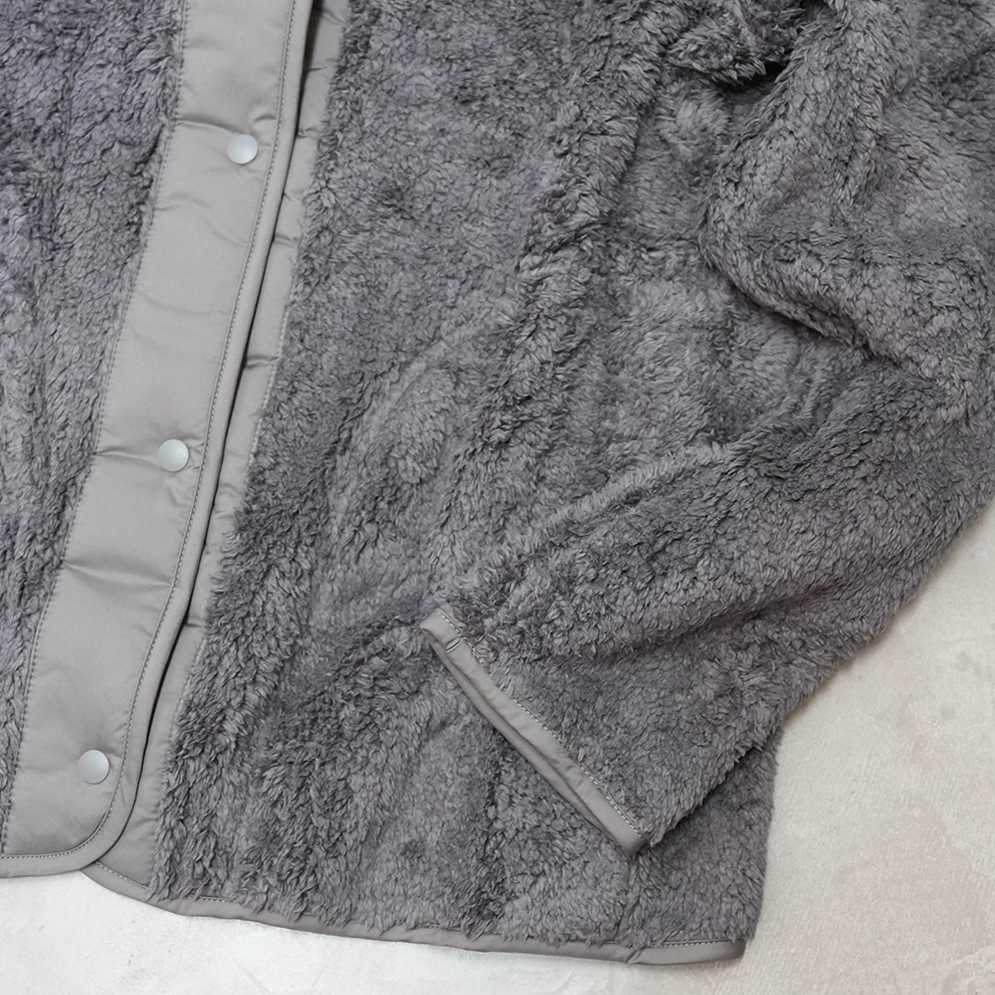 リサイクル・ポリエステル100%のソフトなハイパイル・フリース素材を使用した温かいジャケット。ストレートなカットで襟なしのシンプルなデザインで、タフタの縁取りがすっきりとしたモダンな装いを演出。
