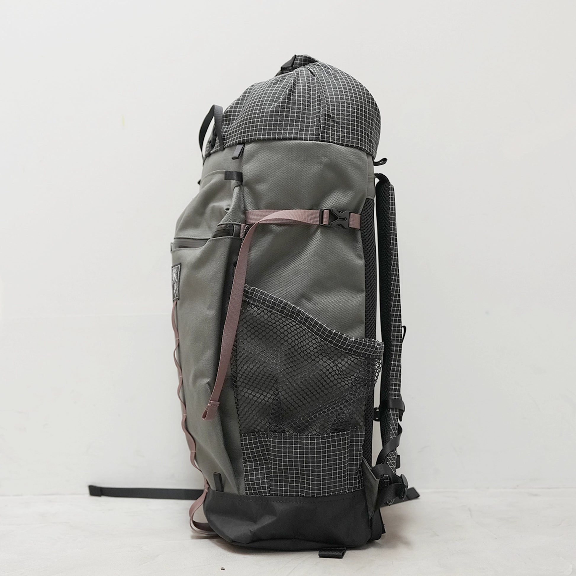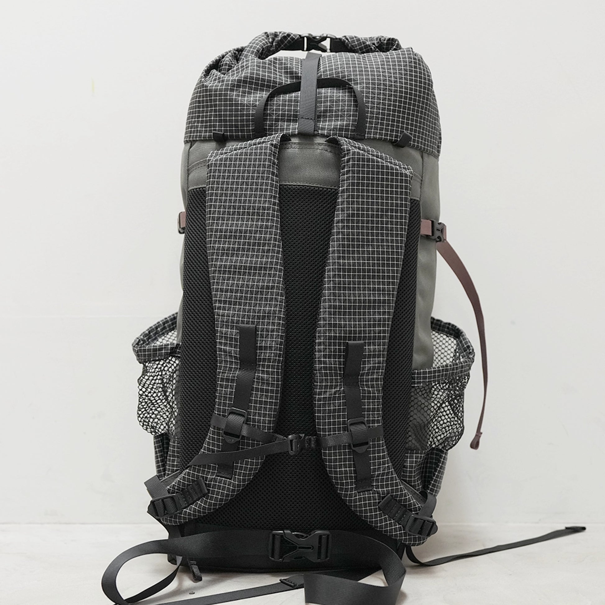 メインの素材はタフな1000デニールのナイロン、80年代の古き良きヘビーデューティープロダクトへのオマージュが杢の入ったナイロンの表情と独特なカラーで表現されています。日本の山域に多い花崗岩などの岩場においてのスレなどに強く、また冬期にスキー等をサイド部分にアタッチした場合にも対応できる強靭な素材を選んでいます。冬期にピッケルやアイゼンと干渉する、フロントパネルや摩擦頻度 の高いハーネス部分には割けに強いダイニーマ X グリッドストップを使用。スレが多く水に濡れる頻度の高いボトムとロールトップ部分には軽量で強く、また防水性の高いX-PACを使用しています。生産効率のみを追求するのではなく、適材適所の考え方で素材選択を行った結果、このマルチファブリックの結論に達しました。