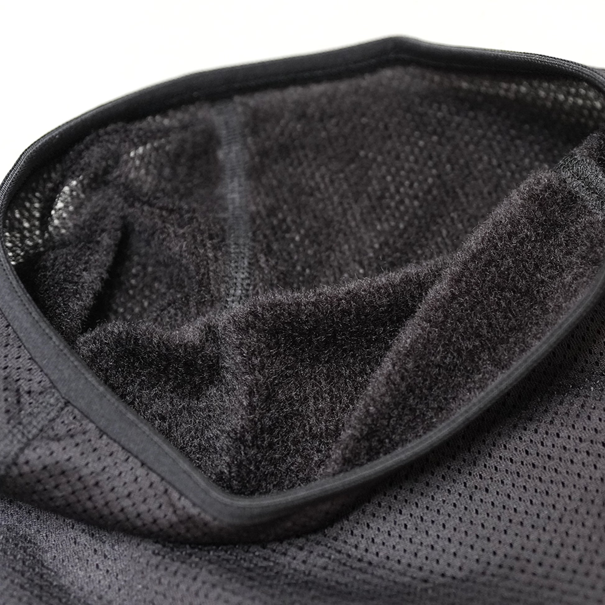 表のメッシュ素材に保温材になる異形断面中空ポリエステル起毛繊維を一体化させたメッシュフリース素材のOcta®CPCP®。その軽さと暖かさ、熱抜けの良さが特徴のポリエステル生地。 通常は裏地として使うがSTATICでは単体フリースとして採用しました。
