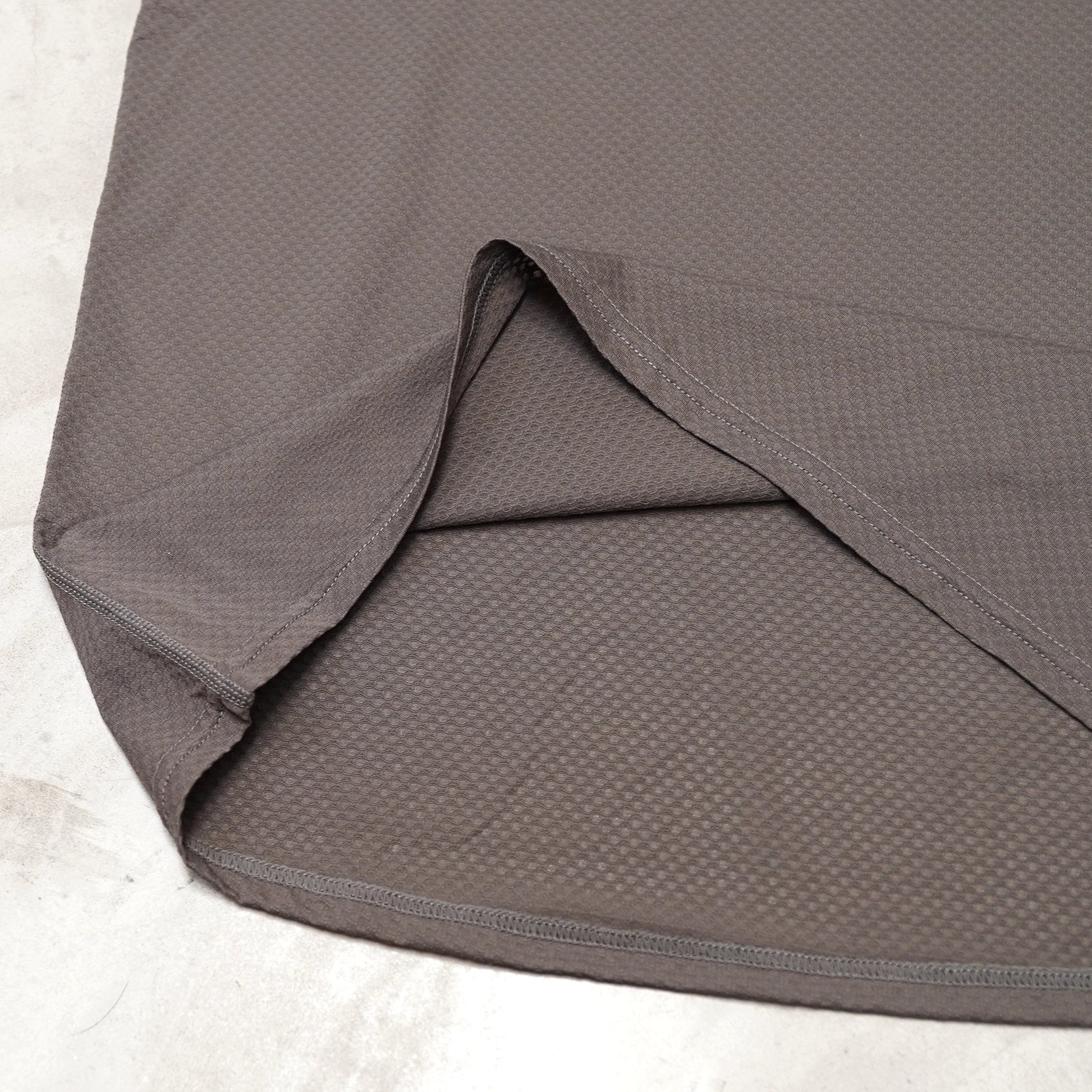 新たに加わる化繊Tシャツシリーズ。メッシュ構造により通気性を上げ、激しい活動にも蒸れず、速乾性が高い蒸した夏用のアイテム。ポリウレタンを加えることなく、糸を捲縮させることによるストレッチ性と、ポリウレタンを含まないため、保水性が落ち速乾性が上がります。また、ポリエステル100%なので裁断屑や着用後の衣類の再生プログラム”ByeHello"で再度糸にし循環させることができます。