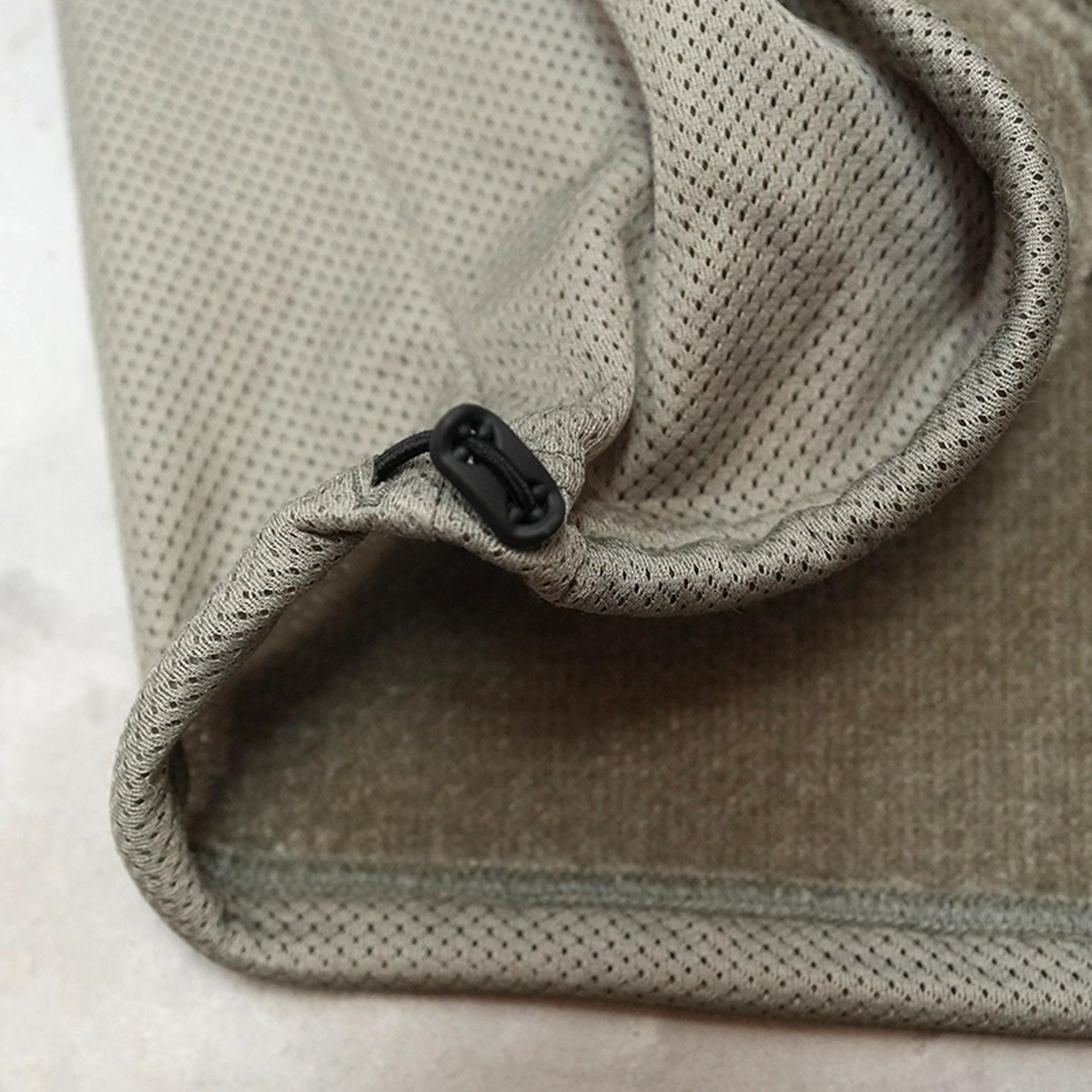 表のメッシュ素材に保温材になる異形断面中空ポリエステル起毛繊維を一体化させたメッシュフリース素材のOcta®CPCP®。その軽さと暖かさ、熱抜けの良さが特徴のポリエステル生地。 通常は裏地として使うがSTATICでは単体フリースとして採用しました。