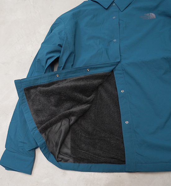 ミドラーとして活躍するウールの山シャツから着想を得たソフトシェルシャツ。表地ははっ水性があり雪も付きにくいソフトシェル素材を採用。裏地は中空糸を使用したオクタフリース素材。身頃はふわふわとした起毛で、保温性とともに吸水性にも優れています。袖や脇部分は袖通しを考慮してフラットな面に切り替え。左胸には小物類の収納に便利なファスナーポケットを配置。身生地と同色のスナップボタンもデザインのアクセントになっています。静電気の発生を抑えた静電ケアに配慮。タウンユースに適したデザイン性を持ちながら、登山からスノーシーンまで秋冬のさまざまな場面で活躍する機能性を備えた、テクニカルなウエアです。