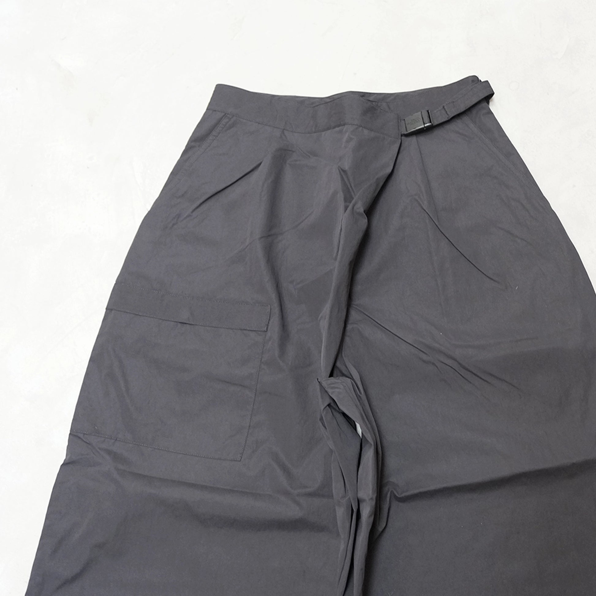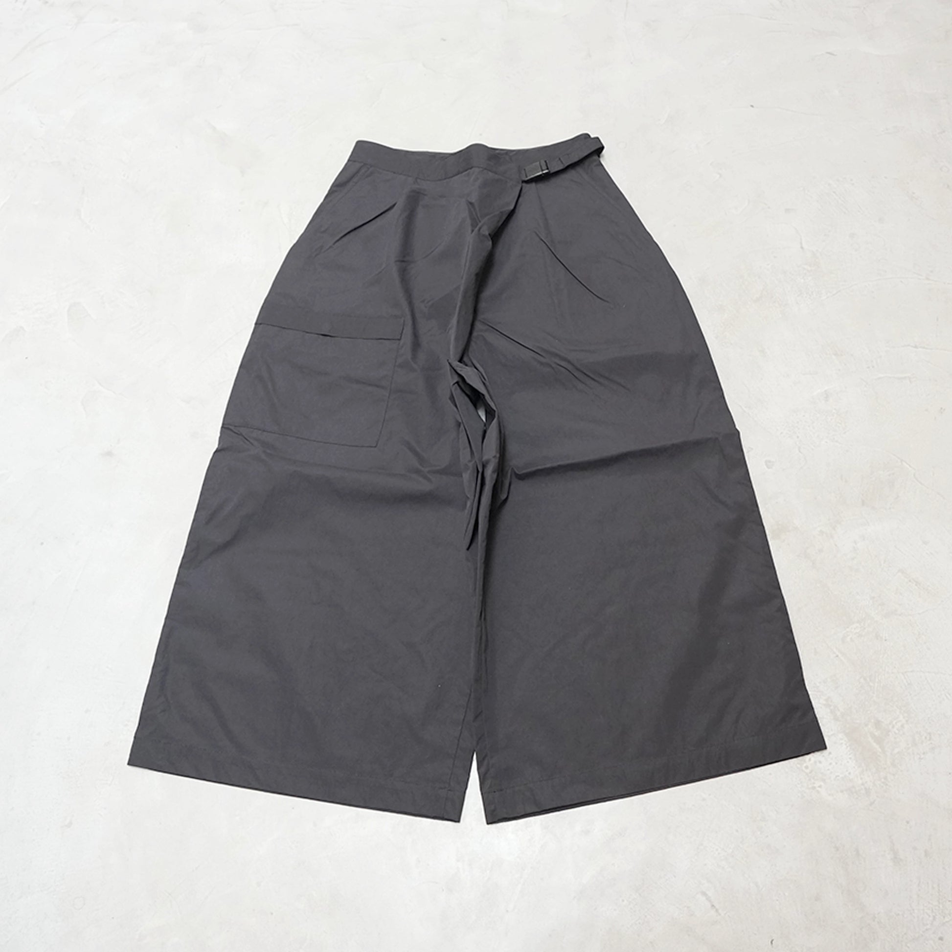 高密度のウェザークロスを使用したラップキュロットです。リサイクルナイロンとオーガニックコットンを使用したウェザークロス。表面に微起毛加工を入れることでやさしく、滑らかな風合いです。