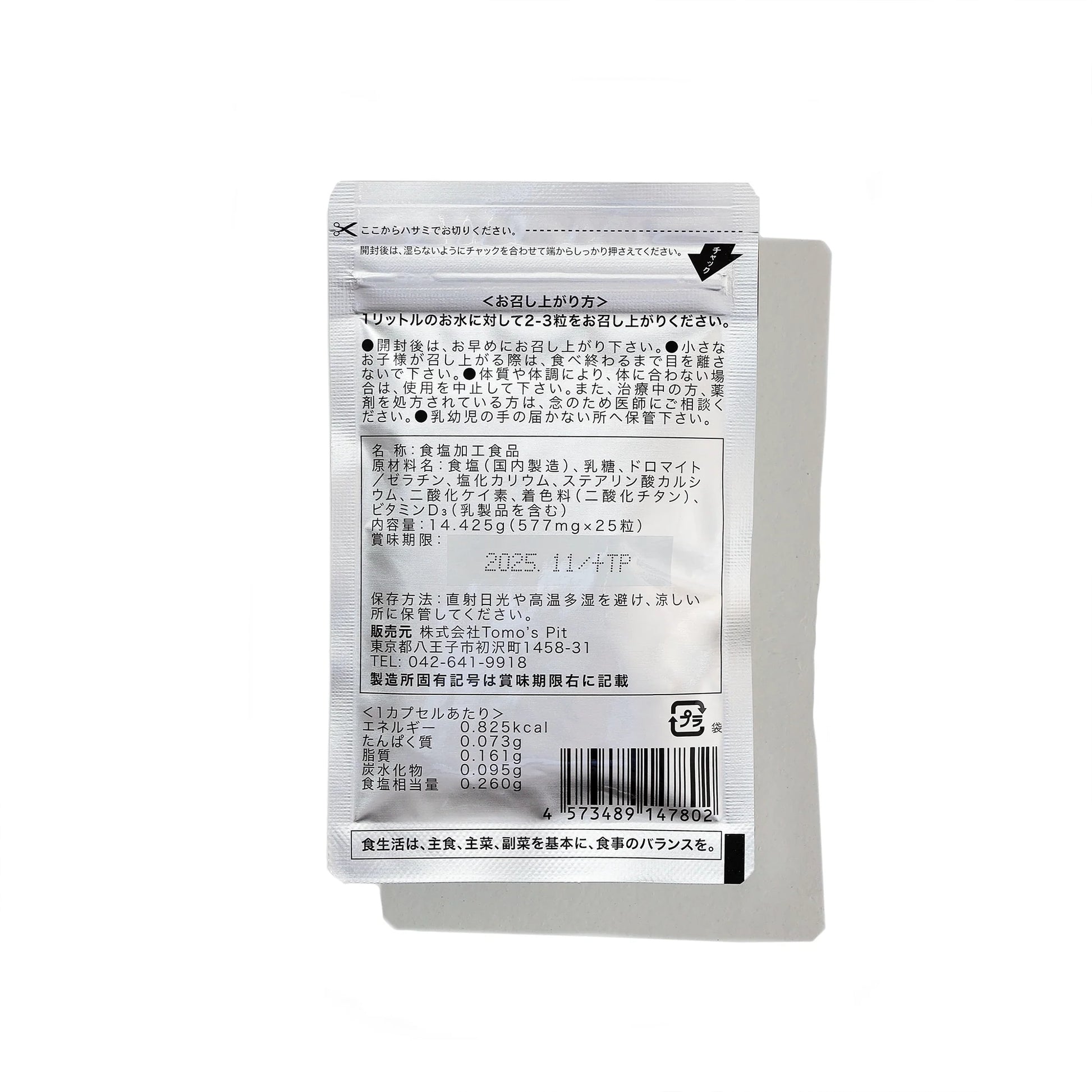 | 原材料名 | 食塩(国内製造)、乳糖、ドロマイト/ゼラチン、塩化カリウム、ステアリン酸カルシウム、二酸化ケイ素、着色料(二酸化チタン)、ビタミンD3(乳製品含む) |